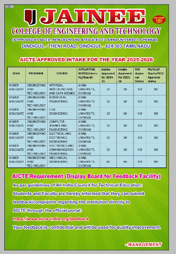 Students and Faculty are hereby informed that they can submit feedback/complaints regarding the institution directly to AICTE through the official portal: